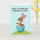 This greeting card shows a cute, human-like bunny with warm brown fur, pink inner ears, and big blue eyes that seem to glance up with a friendly, inviting look 🐰. A soft pink blush sits on its cheeks, and a few darker brown spots add detail across its body as it peeks out from a cracked egg. The egg shell is turquoise with wavy pink bands and scattered pink dots, giving it a festive, sweet look that feels like it’s meant to be shared between close friends. The bunny rests on a gently rolling green hill with a few simple grass strokes, set against a wide sky-blue background that keeps the scene airy and calm 🌷. Near the top, a line of black sans-serif text asks, “What is invisible and smells like a carrot?” centered and easy to read. The bunny’s upright posture and slightly tilted head add a tender, curious energy, like it’s waiting for someone special to answer back. The cracked shell pieces angle outward around the bunny, with jagged edges and bright turquoise fragments framing its little paws.