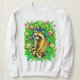 Das Sweatshirt in einem niedlichen Waschbär liegt inmitten eines Gartens, gerahmt von hellgrünen Blätter, gelben Gängen und rosa Tulpen. Die kühnen Farben und die spielerischen Details verleihen dem Design eine fröhliche und lebendige Atmosphäre, die den Charme der Wälder mit einem Hauch von Gartenfarbe verbindet.
