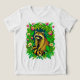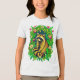 Das Shirt in einem niedlichen Waschbär liegt inmitten eines Gartens, gerahmt von hellgrünen Blätter, gelben Gängen und rosa Tulpen. Die kühnen Farben und die spielerischen Details verleihen dem Design eine fröhliche und lebendige Atmosphäre, die den Charme der Wälder mit einem Hauch von Gartenfarbe verbindet.