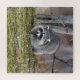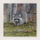 Ein Waschbär steht vor einem bewaldeten Hintergrund.