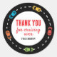 Dieser Aufkleber verfügt über eine kreisförmige Rennstrecke mit bunten Rennautos mit einer anpassbaren Danksagung. Ein niedliches, farbenfrohes Geburtstagsaccessoire für eine Rennwagen-Geburtstagsparty!
