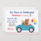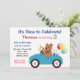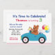 Laden Sie Familie und Freunde zu der nächsten Geburtstagsparty Ihres Kindes mit diesen schönen Rennwagen-Party Einladungen ein. Ein Teddybär und andere Spielzeuge in einem niedlichen blauen Auto mit bunten Geburtstagsballons. Stellen Sie sich mit Ihren Party-Details ein! Einige Elemente © Lilly Bimble