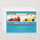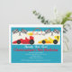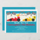 Beginnen Sie Ihren Geburtstag mit unserer niedlichen Rennwagen-Geburtstagsfeier mit einem gelben Rennwagen und einem gelben Rennwagen mit einem Set mit karierten Rennflags auf blauem Hintergrund. Voll anpassbar durch Sie mit Ihren Informationen. ©Riefka Design