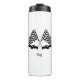 Zwei Rennwagen vor der Schachflagge mit Unterschrift