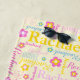 Typografischer Name und Blume in hellrosa, gelb, aqua und weiß auf einem hellcremig gelben Hintergrund. Die Hintergrundfarbe kann bei Bedarf geändert werden. Spaß personalisierter Grafik-Text und Blume Kunst Strandtuch. Personalisieren Sie mit Ihrem eigenen Namen, liest derzeit Rachael für Hilfe bei Personalisierung und anderen Namen Länge bitte kontaktieren Sie mich. © Art and Design by Sarah Trett for www.mylittleeden.com