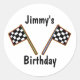 Fun Geburtstagsfeier Aufkleber oder Umschlag Aufkleber in Weiß mit schwarzem, individuellem Text gemacht. Die Grafik zweier gekreuzter Fahnen schmückt die Mitte. Personalisieren Sie den Text für den besonderen Tag Ihres Sohnes. Großartig mit unseren kleinen Jungs Race Auto Birthday Einladungen.