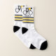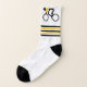Fahrradfahrer reiten auf seinen Fahrradsocken, die eine minimalistische Ikone einer schwarzen Silhouette mit einem gelben Oberteil und Ihrem Namen mit einem gelb-schwarz gestreiften Rand zeigen.
