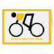 Fahrradfahrer fahren auf seiner eigenen Grußkarte, die ein minimalistisches Symbol einer Silhouette mit schwarzem Fahrrad mit gelbem Oberteil zeigt und den Text auf weißem Hintergrund mit gelbem Rand.