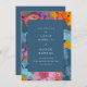 Die Save the Date Einladung zeigt ein Blumendesign in gouache, mit lebendigen, abstrakten Blüten in Rosa, Purpur, Blues und Gelb. Kühne Pinselstriche und malerische Texturen schaffen ein modernes, künstlerisches Ambiente.