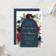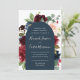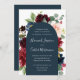 Unsere Einladung zur Hochzeit von Radiant Bloom umgibt Ihre Hochzeitstage-Details mit einem Bogen von bemalten Aquarellfarben-Blume in bordeauxroter Marsala, Rosa und Marineblau, mit grünem botanischem Blattwerk und Eukalyptus-Blätter. Eine schöne Wahl in üppigen, gesättigten Farben für Herbst- oder Winterhochzeiten.