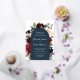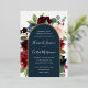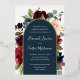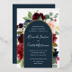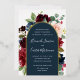 Unsere Einladung zur Hochzeit von Radiant Bloom umgibt Ihre Hochzeitstage-Details mit einem Bogen von bemalten Aquarellfarben-Blume in bordeauxroter Marsala, Rosa und Marineblau, mit grünem botanischem Blattwerk und Eukalyptus-Blätter. Eine schöne Wahl in üppigen, gesättigten Farben für Herbst- oder Winterhochzeiten, mit luxuriöser Goldfolie.