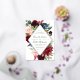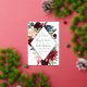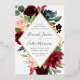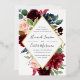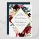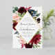 Unsere Hochzeitseinladung von Radiant Bloom umgibt Ihre Hochzeitsdetails mit einem geometrischen Rahmen von bemalten Aquarellfarben-Blume in bordeauxroter Marsala, rot-rosa und marineblau, mit grünem Eukalyptus-Blattwerk. Eine moderne und Bio Wahl in Grün und Weiß mit üppigen, farbenfrohen Botanicals und handgeschriebenen Schriften, mit luxuriösem Goldfoliendesign.
