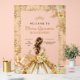 Dieses Begrüßungsschild aus Quinceañera besticht durch eine elegante goldene filigrane Grenze mit weichen pfirsichfarbenen und goldenen Blumenakzenten und schafft ein romantisches und raffiniertes Ambiente. Das Design umfasst zarte Schmetterlinge und einen klaren, weißen Hintergrund, der die warmen, femininen Farben unterstreicht. In der Mitte unten ist eine Abbildung einer jungen Frau in einem Blume-geschmückten Ball-Gewand mit fließendem Haar und einer Blumenkrone, die einen märchenhaften Charme verleiht. Der Mix aus klassischen Serifen und anmutigen Script-Schriftart verstärkt das raffinierte und feierliche Gefühl des Zeichens.