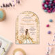 This quinceanera invitation features an elegant gold and cream theme with intricate lace-like borders, Radian Bloom floral accents, and delicate butterflies. At its center is an illustration of a girl in a luxurious gold-accented gown with Radiant Bloom flowers, adding a touch of grace and sophistication. The combination of script and serif fonts enhances its refined and celebratory style, perfectly suited for the occasion.