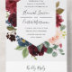 Unsere Hochzeitseinladung von Radiant Bloom umgibt Ihre Hochzeitstage-Details mit einem geometrischen Rahmen von bemalten Aquarellfarben-Blume in Bordeaux-Marsala, Rosa und Marineblau, mit grünem botanischem Blattwerk und Eukalyptus-Blätter. Dieses Design ist in üppigen, gesättigten Farben für Herbst- oder Winterhochzeiten gehalten und bietet einen abnehmbaren UAWG-Bereich mit QR-Code für den Scanner.