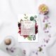 Elegante und moderne Hochzeitsfeier mit Blumenmuster und bordeauxroten Marsala, blütenrosa Blume mit marineblauen Knospen und grünem Eukalyptusblättern. Ihre Hochzeitsdetails überlagern sich auf einem schieren weißen Element in elegantem, schwarzem Lettern mit handgeschriebenem Skript und echter Goldfolienbespannung.