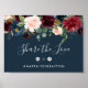 Dieses elegante botanische Schild lasse den Gästen, die unsere Hochzeitskollektion von Radiant Bloom kennenlernen möchten, über Ihren individuellen Hochzeitshashtag für Social Media Sharing Bescheid. Personalisieren Sie die Kopfzeile und den Hashtag (mit "Share the Liebe" gezeigt), gerahmt durch einen oberen Rand von schmuckfarbenen Aquarellfarben-Blume in bordeauxroten Marsala, Rosa, Marineblau und Salbei grün, auf einem reichen marineblauen Hintergrund.