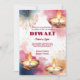 Die Vorderseite der Einladung hat einen weichen Aquarell mit Blau- und Marontönen auf einer weißen Leinwand. Es zeigt Veranstaltungsdetails in elegantem, fließendem Drehbuch, mit handgemalten Diya-Lampen verstreut über das Design. Intrikierte Blumenmuster und zarte Dekorationen in Blau und Mond sorgen für eine festliche Touch. Die Rückseite der Karte hat ein passendes Aquarellmotiv, Platz für den eigenen Text und Diwali Wünsche, gerahmt von mehr Diya-Lampen und subtilen dekorativen Elementen. Die gesamte Ästhetik ist herzlich, einladend und perfekt für das Festival der Lichter