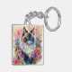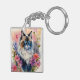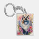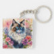Der Schlüsselanhänger ist mit zarten Aquarellkunstwerken einer schönen Puppenkatze aus Lappen, umgeben von Blume, in einem weiblichen ästhetischen Tierportrait ausgestattet. Die flauschige, blau-mit Augen Katze starrt in diesem lebendigen, mehrfarbigen Blumengemälde zur Seite.