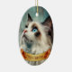 Ein nahes Portrait eines Ragdoll Kätzchens mit auffallend blauen Augen. Die Katze hat einen flauschigen, weißen Mantel und trägt einen schwarzen Kragen mit einem blauen Edelsteincharm. Die Augen der Katze sind weit offen und fokussieren sich auf etwas außerhalb der Kamera, was ein Gefühl von Neugier und Verwunderung schafft. Der Hintergrund ist weich, pastellblau und die zarten rosa Blüten verstreut, was dem Bild eine Touch von Weisheit und Eleganz verleiht.