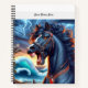 Zwei Kunstwerke eines dramatischen schwarzen Pferdes in der Nähe des Ozeans während eines Blitzes, gedruckt auf der Vorder- und Rückseite eines Notebooks. Copyright (c) 2024