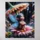 Eine niedliche kleine Fee, die unter einer großen Blume im Regen sitzt.