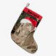 Niedliches Foto von Regen, ein süßer Weimaraner Hund, mit einer Weihnachtsmannmütze auf einem Weihnachtsfeiertag Strumpf. Text ist leicht anpassbar.