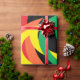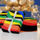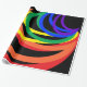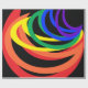 Dieses festliche Verpackungspapier weist ein abstraktes dreidimensionales Muster von Regenbogenhalbmonden in Rot, Orange, Gelb, Grün, Blau und lila auf schwarzem Hintergrund auf.