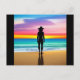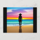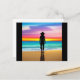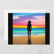 Silhouette eines Menschen mit lockigen Haaren mit einem Hut, stehend am Strand beim Sonnenuntergang, der Himmel ist eine Mischung aus Blau, Rosa und Orange, der Ozean ist türkis, der Sand golden, das Bild ist ein digitales Bild mit einer glatten Textur. Der Ozean ist türkisblau, der feuchte Sand spiegelt die Silhouette und die Farben des Himmels wider.