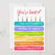 Rainbow Birthday Cake Party Einladung, Hell, fett und vielseitig. Diese Geburtstagsfeier ist mit aquamarinen, periwinkelblauen, gelben, orangefarbenen und heißen rosafarbenen Kuchen mit Aquarelle und Textur kreiert.