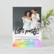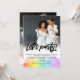 LGBT Fortsetzung Hochzeitseinladung für eine Hochzeitsfeier nach einer kleinen gesellschaftlichen Zeremonie. Stolze Fortsetzung Hochzeitseinladung personalisiert mit Ihren Hochzeitsfeiern, eine auf der anderen Seite der Einladung. Lasst uns ein schwarzes Pinselskript über den unteren Rand des Fotos Party machen.