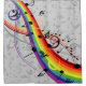 Schwarze Noten schwimmen auf einem Regenbogen mit wirbelnden Regenbogenfarben. Der Hintergrund ist mit grauen Noten in einem leichteren Farbton gehalten.