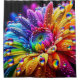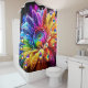 Dieser Duschvorhang hat eine Regenbogen-Blume darauf.