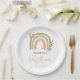 Niedliches Boho Rainbow Baby duscht maßgefertigte Teller aus Papier mit gedämpften Farben und Erdtönen. Entwickelt und illustriert mit Liebe von Kristine Lee www.kristineleedesigns.com
