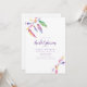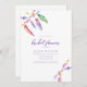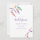Mit dieser exquisiten Einladung bereiten Sie sich auf ein unvergessliches Brautparty vor. Es ist im boho-Stil konzipiert und präsentiert pastellfarbene Regenbogenfedern auf einem traumhaft blauen Aquarellhintergrund. Die Kombination von bohligen Elementen und sanften Farben schafft eine bezaubernde Ästhetik, die Ihre Gäste begeistern wird.