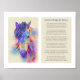 Dieses Plakat zeigt ein Pferd in der Nähe, das blau, lila, rot, rosa und gelb gefärbt ist, und die wunderschöne Rainbow Bridge for Horses von einem unbekannten Autor, um diejenigen zu beruhigen, die den Verlust ihres geliebten Pferdes beklagen: Am Rande eines Waldes, am Fuße eines Hügels, ist eine üppige, grüne Wiese, auf der die Zeit still steht. Wo die Freunde von Mann und Frau laufen, wenn ihre Zeit auf Erden vorbei ist und getan ist. Denn hier, zwischen dieser Welt und der nächsten, ist ein Ort, wo geliebte Kreaturen Erholung finden. Auf diesem goldenen Land warten sie und spielen, bis die Rainbow Bridge eines Tages überquert wird. Sie leiden nicht mehr, in Schmerz oder Trauer, denn hier sind sie ganz, ihr Leben voller Freude. Ihre Gliedmaßen werden wiederhergestellt, ihre Gesundheit erneuert. Ihre Körper haben sich mit Kraft verheilt. Sie trotzen ohne Pflege durch das Gras, bis sie eines Tages jammern und an der Luft schnüffeln. Alle Ohren heben sich nach vorn, die Augen scharf und aufmerksam. Dann bricht plötzlich jemand aus der Herde. Denn nur in dieser Sekunde gibt es keinen Raum für Reue. Wie sie einander sehen...eine Person...ein Pferd. Also rennen sie sich an, diese Freunde aus langer Zeit Die Zeit ihrer Trennung ist endlich vorbei. Die Traurigkeit, die sie während ihrer Zerlegung empfanden, hat sich in jedem Herzen wieder zur Freude gewandelt. Sie schnüffeln mit einer Liebe, die ewig dauern wird. Und dann überqueren sie nebeneinander..zusammen.