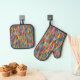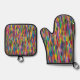 Bright and colorful pot holder and oven mitt set with a design of multicolored brushstrokes.