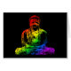 Eine stilisierte Grafik einer Buddha-Statue in Regenbogenfarben.