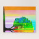 Puzzle in einem Aquarellbaum, bestreut mit Regenbogenfarben, gegen einen lebhaften, regenbogenfarbenen Himmel.