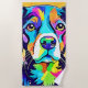 Treffen Sie ein Regenbogenhundeportrait in diesem lebendigen und farbenfrohen Kunstwerk. Chromatische Farbtöne und ein geteilter Hintergrund schaffen ein unterhaltsames und modernes Stück (Dieses Design aus KI). Bestellen Sie noch heute und Embrace the Joy of Shopping!