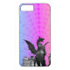 Handy Gehäuse einer schwarz-weißen Drachenstatue auf einem Regenbogenuntergrund.