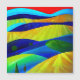 Eine abstrakte Landschaft von sanften Hügeln in lebhaften Farben mit eckigen Linien.