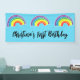 Name des Geburtstagsjungen oder Mädchens auf blauem Banner mit skurrilen Regenbögen.