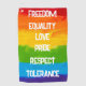 LGBT Pride Moderne Regenbogenstreifen Flag Design mit den Worten "FREEDOM", "GLEICHHEIT", "LIEBE", "PRIDE", "RESPEKT" und "TOLERANCE". Sie können die Textfarbe und den Textstil ändern, Wörter ersetzen oder den Text für ein Bild löschen. Ähnliche Schlüsselwörter: bunt, lgbtq, lgbtqi, lgbtqia, lgbtqia+, Stolz, schwul, lesbisch, que, bisexuell, transgender, trans, bi, pansexual, asexual.
