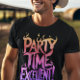 Eine Illustration der Phrase Party Time Hervorragend in rosa, rot und orange stilisierten Flammen vor einem schwarzen Hintergrund.