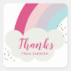 Ein modernes Gastgeschenk bedankt sich bei einem Aufkleber mit einem rauschenden, einhornfarbenen Regenbogen mit weißer, flauschiger Wolke und Kalligrafie Dank. Fügen Sie dies zu einer einfachen Gefälligkeitsbox oder Tasche, um Persönlichkeit und Flair zu Ihren Kindern regenbogenthemed Geburtstagsparty hinzufügen. Achten Sie auf die Koordination von Party-Accessoires und weiteren Farbvariationen von Stacey Meacham.