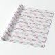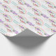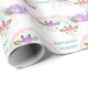Zwei lächelnde Giraffengesichte, eines mit violetten Blumen und das andere mit rosa Blume, liegen unter einem glitzernden mehrfarbigen Regenbogen auf diesem Geburtstagsgeschenkpapier. Fügen Sie einen Lavendel und lila Bouquet und Ihren eigenen Text in aquamarin, und auf einem weißen Hintergrund platziert, haben Sie ein hübsches Packpapier für fast jeden.