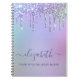 Girly niedliches Notebook mit einfarbigen Regenbogen-Imitaten Glitzer, der einen lila Hintergrund abtropft. Personalisieren Sie mit einem Namen in einem hübschen lila Skript mit Swashes und fügen Sie einen Titel hinzu oder verließ leer.