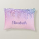 Niedliches Mädchenkissen mit Regenbogen-Imitaten, die Glitzer vor einem rosa Hintergrund tropfen. Personalisieren Sie mit ihrem Namen in lila Schrift.