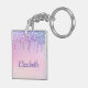 Girly personalisierter Schlüsselanhänger mit regenbogenfarbenen Imitaten, die den Glitzer auf einem rosa Hintergrund abtropfen. Personalisieren Sie mit Ihrem Namen in lila Schrift.